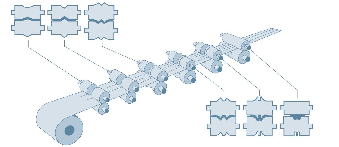 Для производства стальных профилей применяются листогибочный пресс, штамповка, формовка или экструзия, но объем продукции достаточно велик, чтобы оправдать применение профилирования.