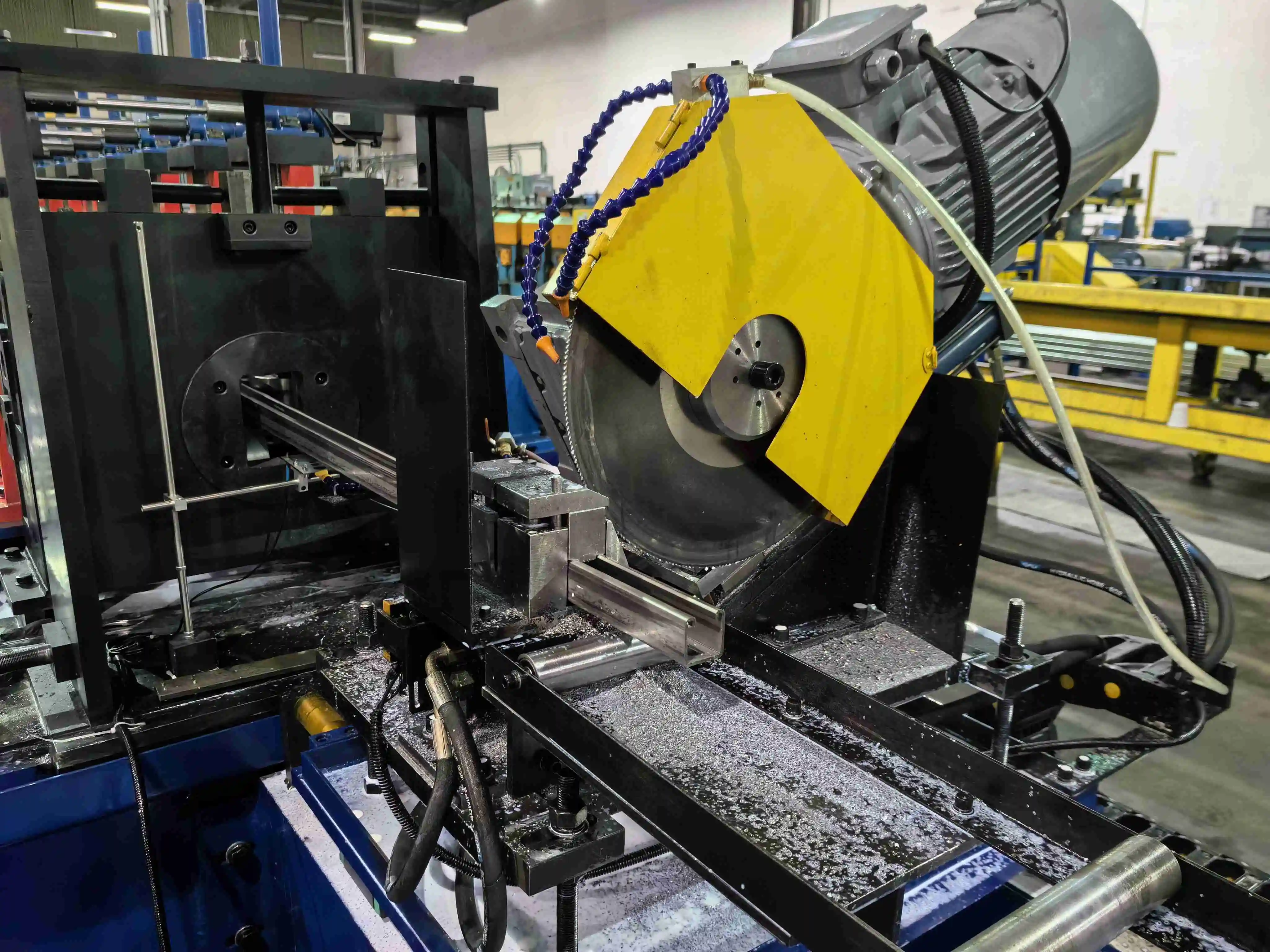 А Профилегибочная машина для производства профилей Uni Strut Для охлаждения и обеспечения скользкости необходима жидкость. Это предотвращает царапание металла роликами и продлевает срок службы станка.